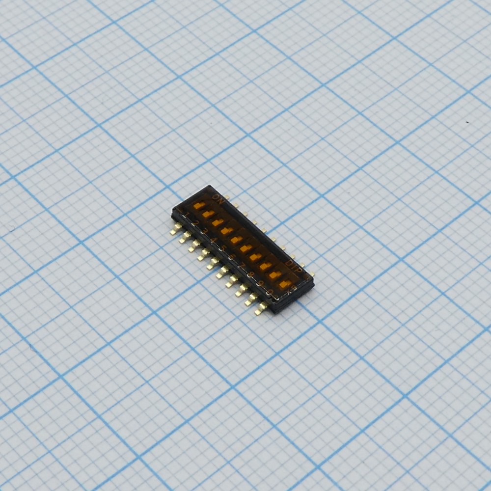 DHN-10F-T-V-T/R, Движковый переключатель 10 групп SMD монтаж 1.27мм 25мА 24В с плёнкой положение ВЫКЛ