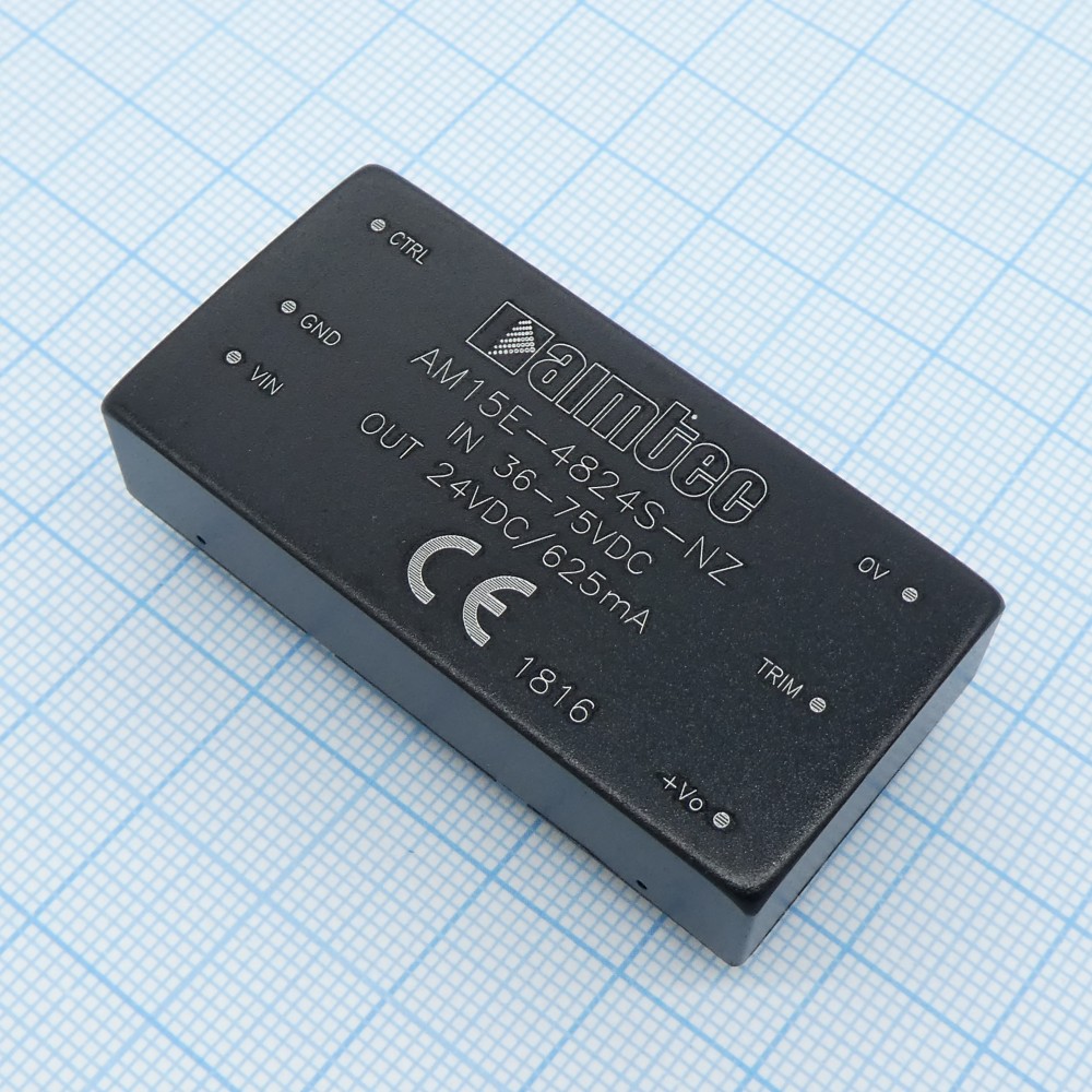 AM15E-4824S-NZ, DC/DC, 15Вт, вход 36…75В, выход 24В/0.62А, изоляция 1500В DC, КПД 89%, максимальная емкостная нагрузка не более 470мкФ, вход On/Off, 2x1", 50.8x25.4x11.8мм, -40…85°C, металл
