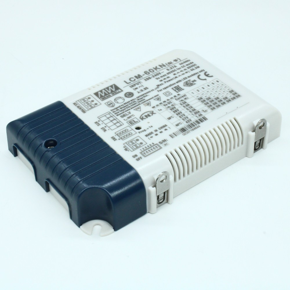 LCM-60KN, AC-DC, 60Вт, стабилизатор тока, вход 180…295В AC, 47…63Гц /254…417В DC, выход 500…1400мA/2…90В, ККМ, изоляция 3750В AC, в кожухе 123.5х81.5х23мм, -30…+60°С, KNX