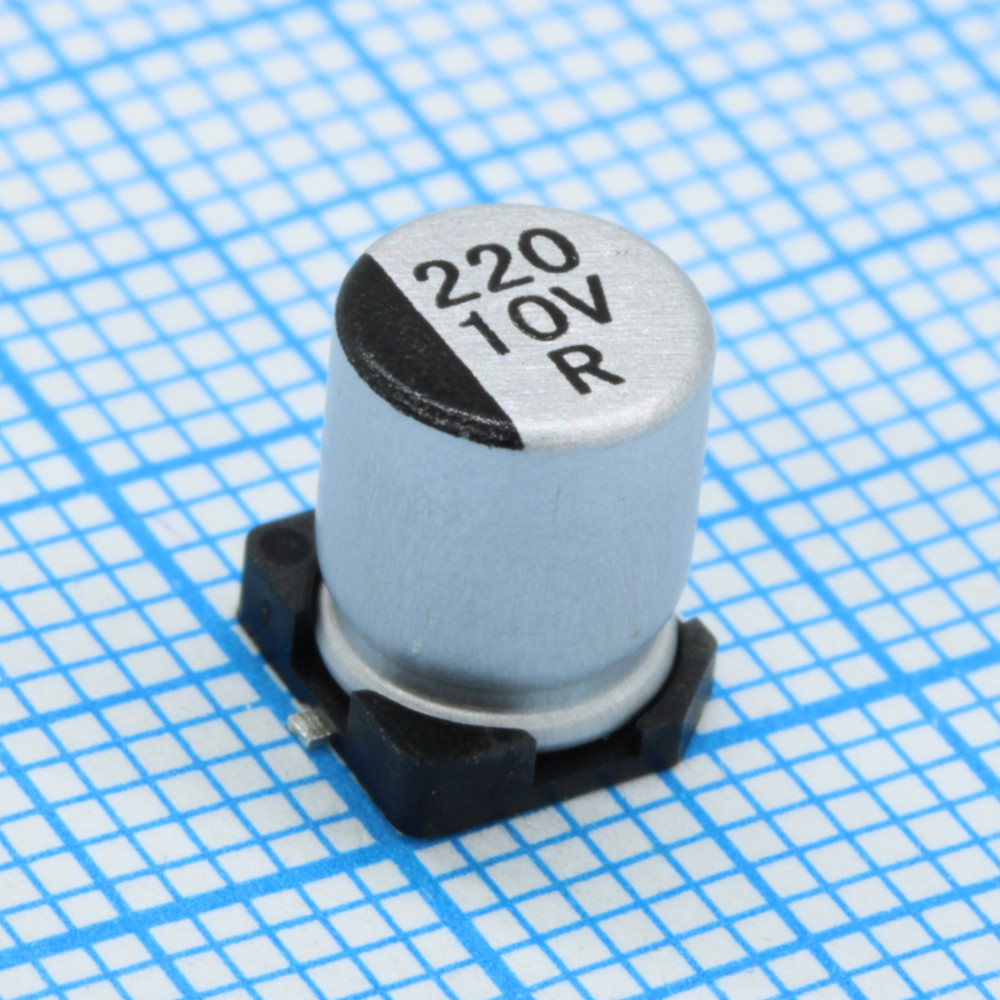 Конденсатор алюминиевый электролитический 220мкФ 10В ±20% (6.3 X 7.7мм) для поверхностного монтажа 280мА 2000час 105°С лента на катушке