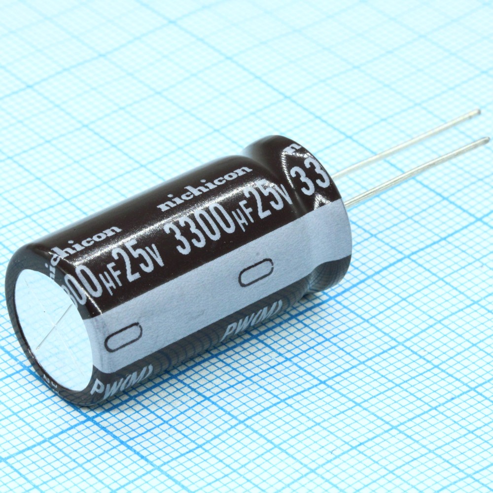 Конденсатор алюминиевый электролитический 3300мкФ 25В ±20% (16 х 26мм) радиальные выводы 7.5мм 1870мА 2000час 85°С россыпь