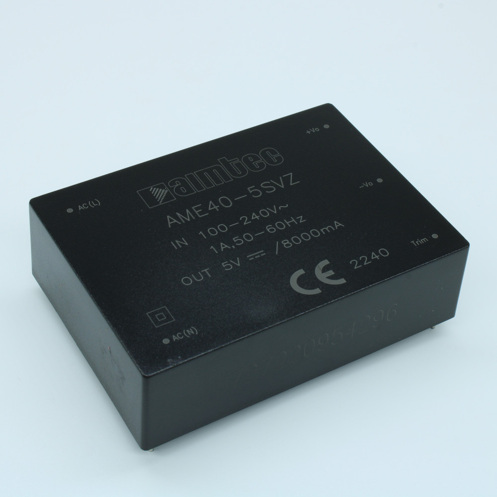 AME40-5SVZ, AC/DC, 40Вт, вход 85…264В, выход 5В/8А, изоляция 4000В AC, КПД 82%, максимальная емкостная нагрузка не более 40000мкФ, 89x63.5x25мм, -40…70°C, пластик