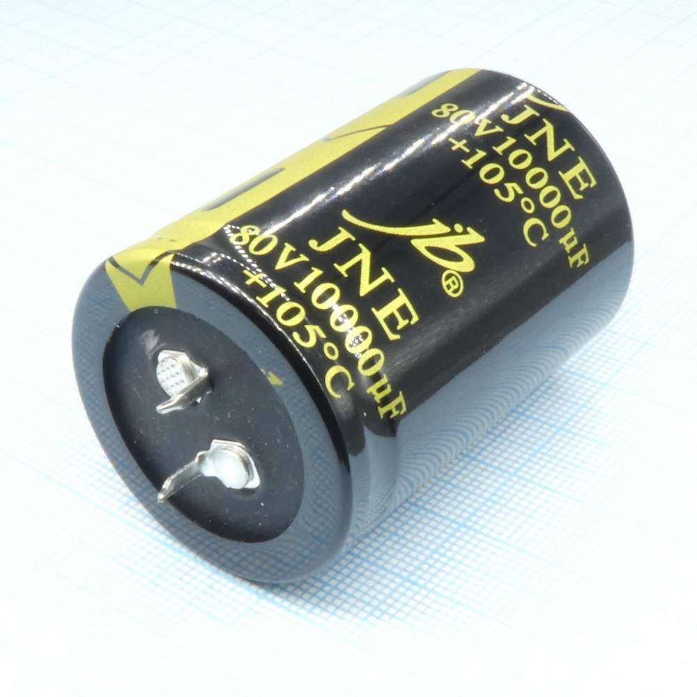 JNE — это серия электролитических конденсаторов c выводами snap in. Конденсаторы имеют базовые параметры рабочего температурного диапазона от -40℃ до +105℃ и время наработки на отказ в 2000 часов.