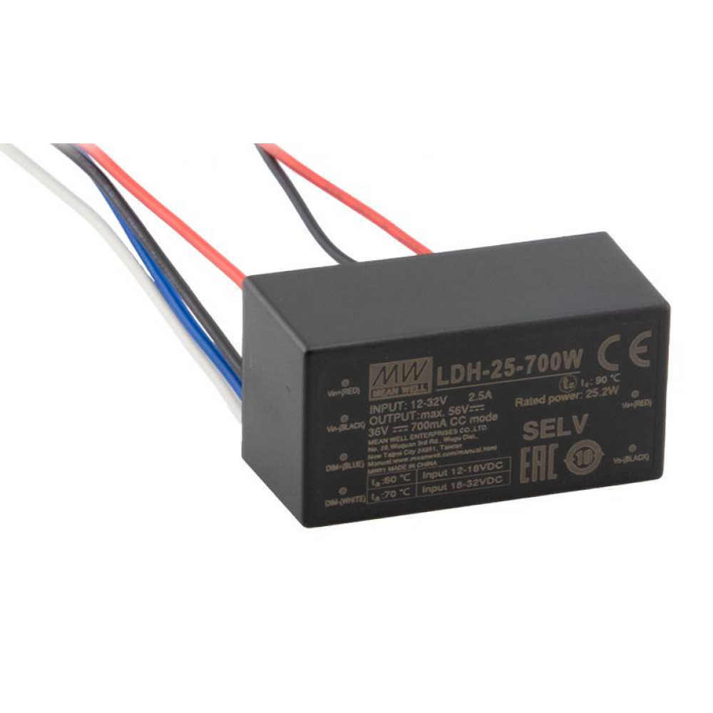 LDH-25-700W, DC/DC LED понижающий, вход 9.5…32В, выход 12.5…36В/0.7А, КПД до 95.5%, вход DIMM 2 in 1, 52.4x27.2x24мм, проводные выводы, -40…70°C, пластик