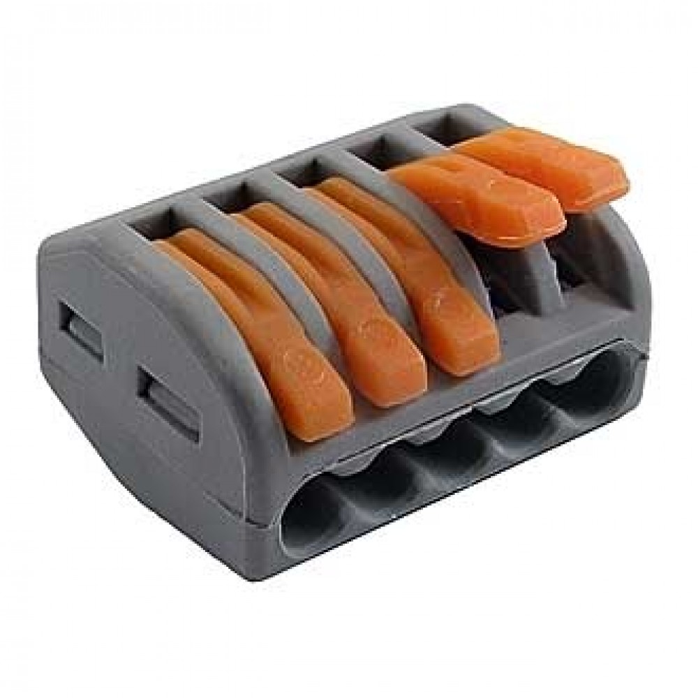 Рычажная клемма, соединительная, универсальная, 5 полюсов, сечение проводника 0,08 - 4,0 мм кв., 250V, 32A,цвет корпуса: серый, цвет рычагов: оранжевый,в упаковке 50 штук (Аналог 222-415)