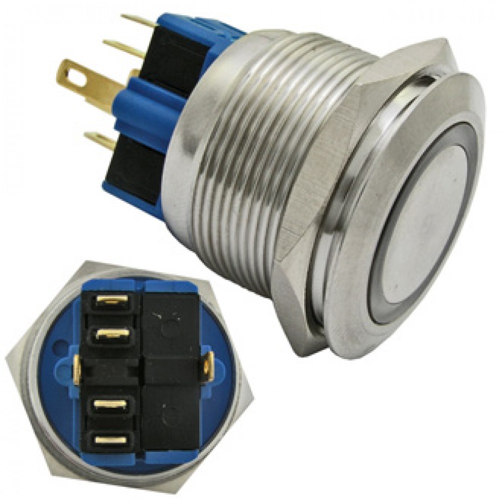 GQ25-11E/B ON-(OFF)+OFF-(ON), Антивандальная кнопка металлическая без фиксации с кольцевой подсветкой, посадочная резьба М25, контакты под пайку