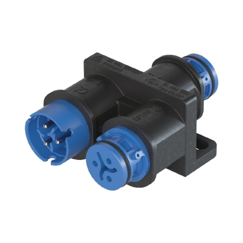 Распределительное устройство RST08i3VL2P1YF V BL, Распределительное устройство (тройник), 1 вход/2 выхода, 3 полюса, параллельное соединение, с продольным уплотнением, с монтажными фланцами, номинальные характеристики: 250/400V, 16A, цвет корпуса: черный, цвет контактной вставки: голубой, серия RST MICRO