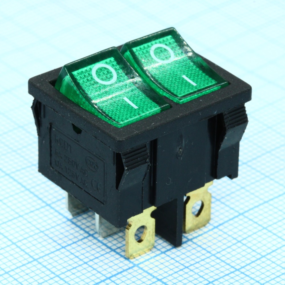 Доставка RWB-305 зеленый , Выключатель клавишный двойной с подсветкой ON-OFF (6c) 6А 250В