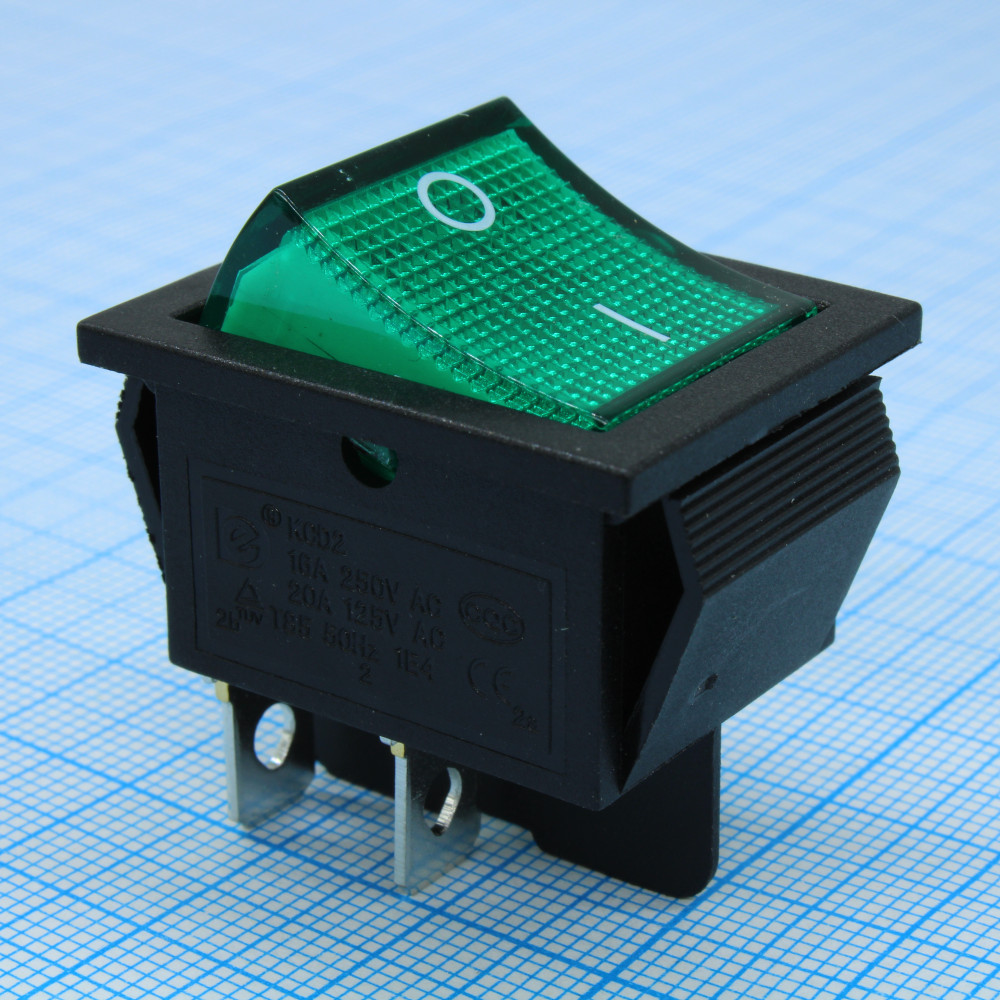 Выключатель клавишный 250V 16А (4с) ON-OFF зеленый с подсветкой предназначен для коммутации электрических цепей переменного тока напряжением до 250В. Клавишные (Рокерные) выключатели применяются в качестве комплектующих изделий различного электрооборудования (в сетевых фильтрах и удлинителях, аудио-оборудовании, блоках питания, электроустановках на различных производствах, автомобилях, и многих других местах). Такой клавишный переключатель имеет два положения. Принцип действия основан на перемещении клавиши в одну из позиций. Для переключения в нужное положение требуется приложить некоторые усилия на клавишу. Монтаж осуществляется без применения винтов на плоских панелях толщиной от 0.8мм до 3мм. Подключение контактов осуществляется плоской клеммой 6.6мм, либо с помощью пайки.