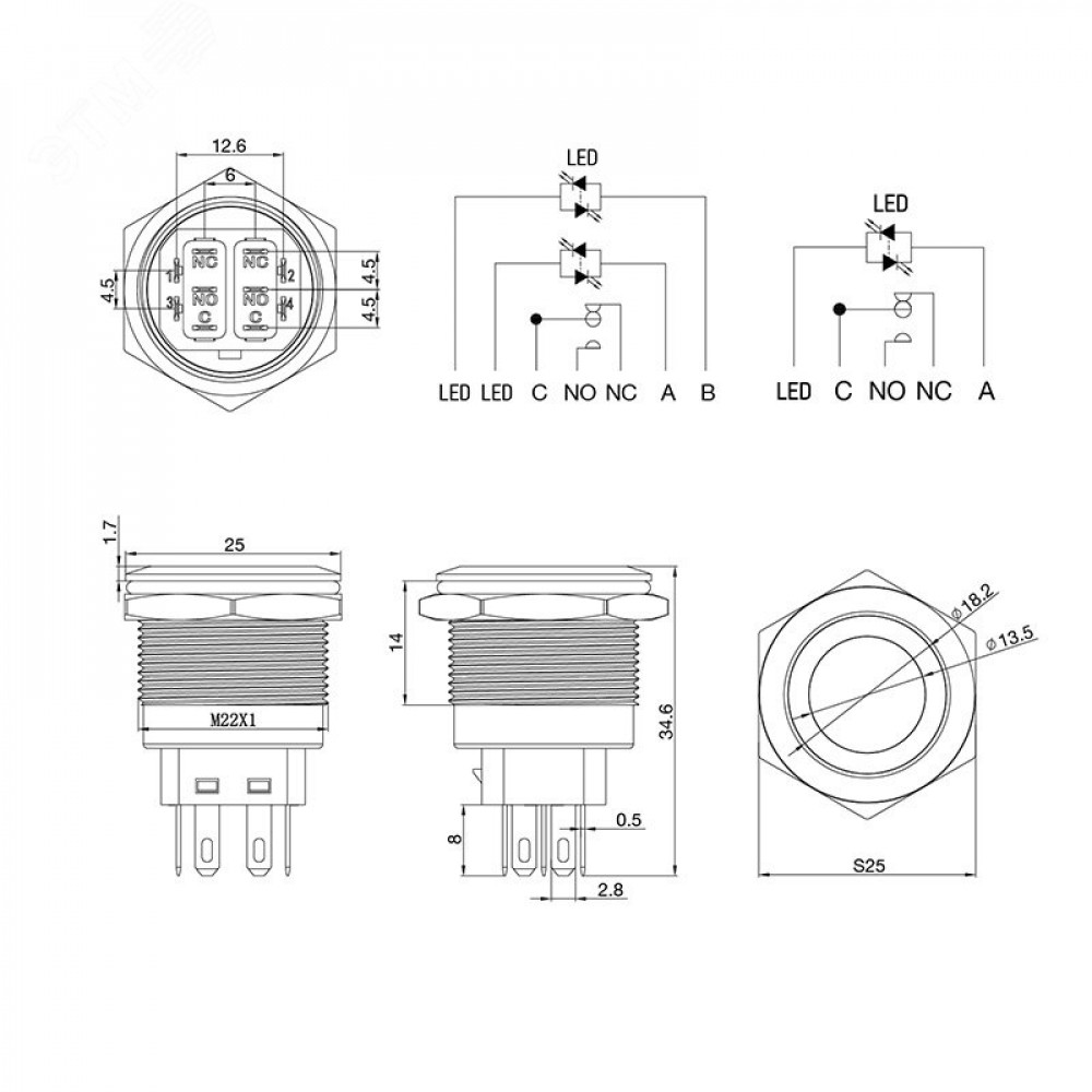 Кнопка антивандальная с подсветкой 250В d22 5A 250B (6c) (ON)-OFF/(OFF)-ON
