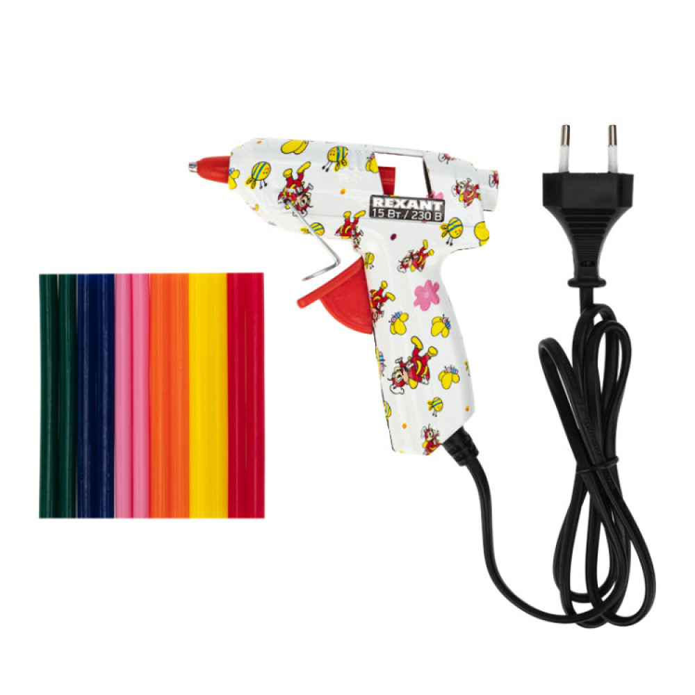 Пистолет клеевой 15W, 7мм набор стержней, цветных 12 шт в комплекте