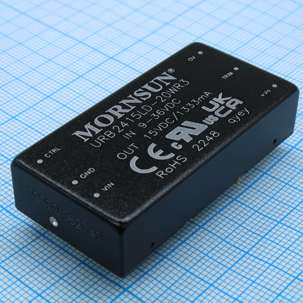 URB2415LD-20WR3, DC/DC, 20Вт, вход 9…36В, выход 15В/1.33А, изоляция 1500В DC, КПД 88…90%, максимальная емкостная нагрузка не более 1000мкФ, вход On/Off, 2x1", 50.8x25.4x11.8мм, -40…85°C, металл
