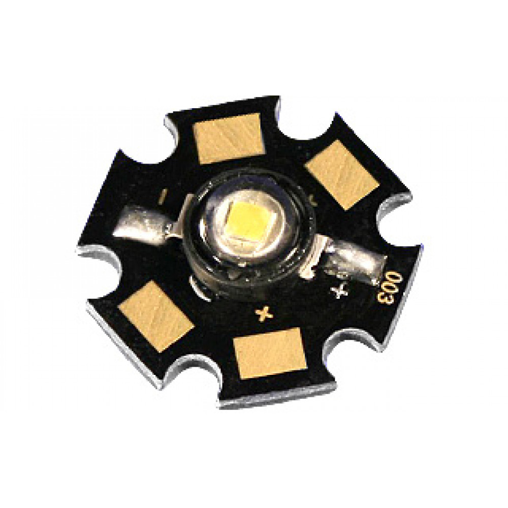 Мощный светодиод типа Emitter, на плате типа STAR d=20 мм, h=6,9 мм, цвет свечения ультрафиолетовый (395-405 нм). Угол излучения 120°. Световой поток 6-8 лм при If=350 мА, P=1 Вт. VF=3.2-3.6 В. Для УФ-сушки, аквариумной подсветки.
