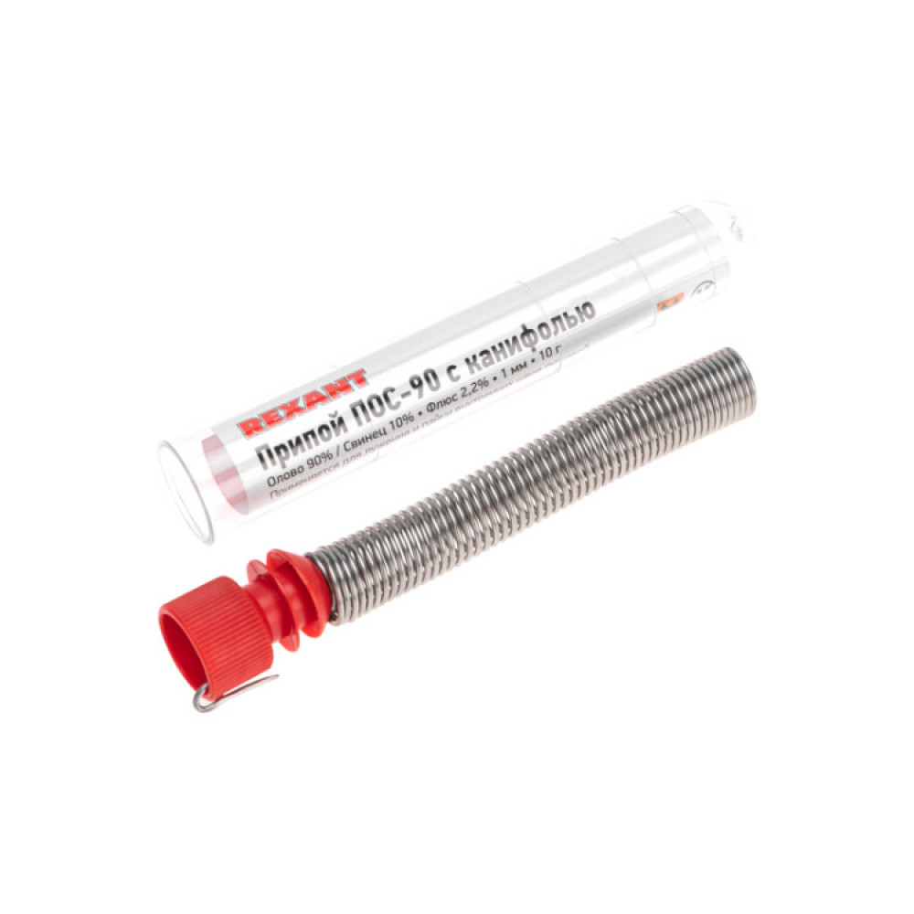 Припой с канифолью ПОС-90 10гр 1.0мм, Припой трубчатый с канифолью REXANT, 10 г, d1.0 мм, (олово 90%, свинец 10%), колба