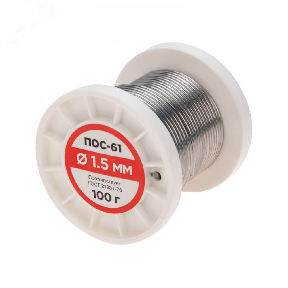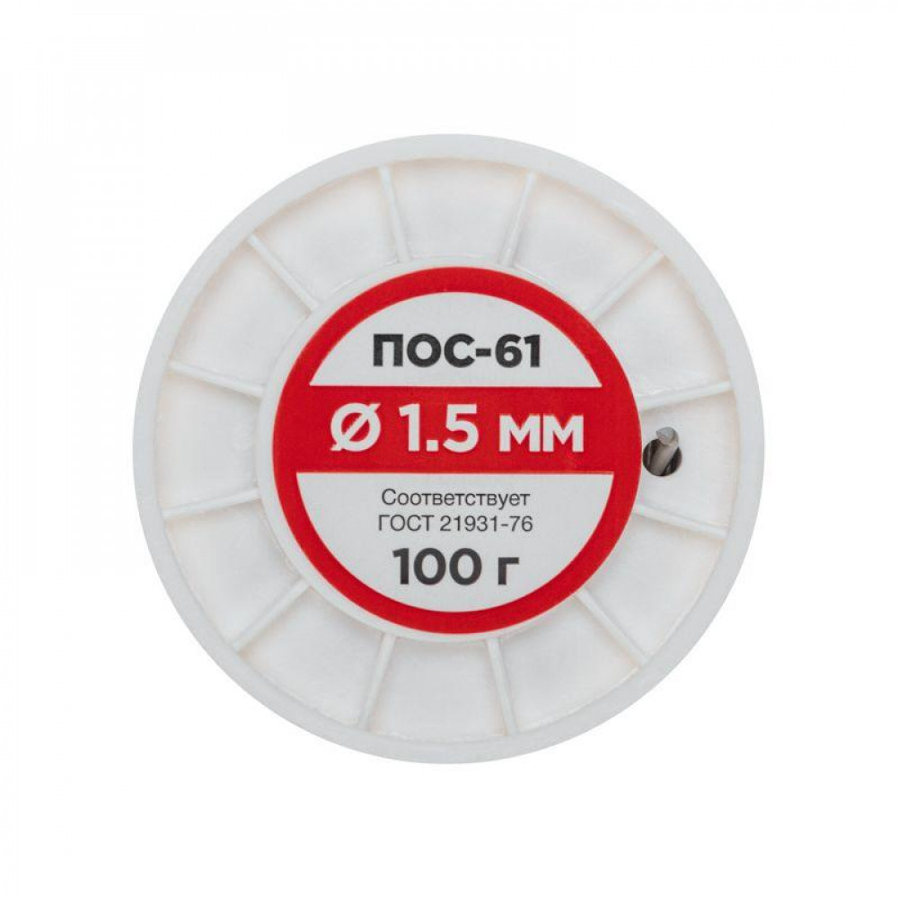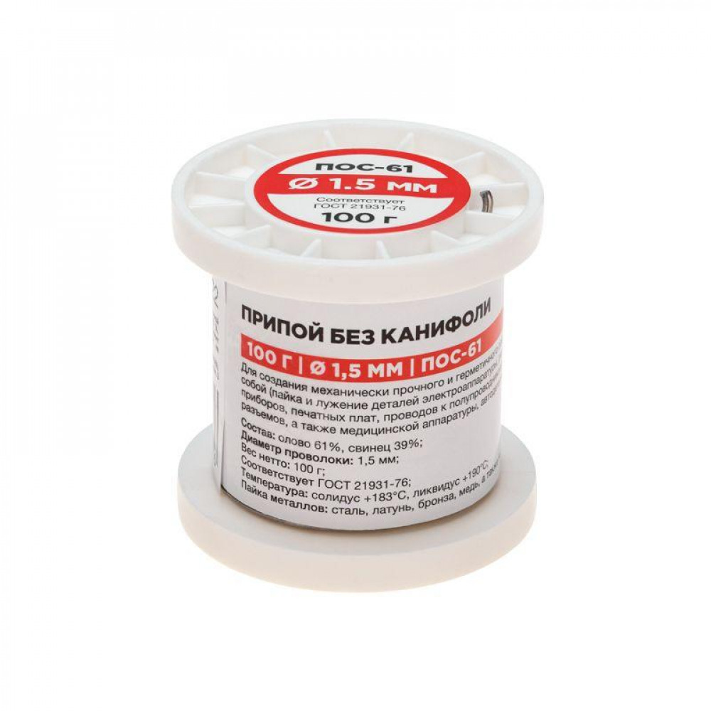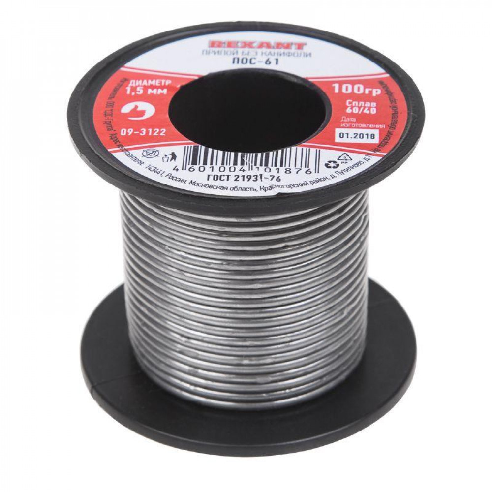 Припой ПОС-61 1.5мм 100 гр. катушка, Припой проволочный без канифоли REXANT (олово 61%, свинец 39%), катушка
