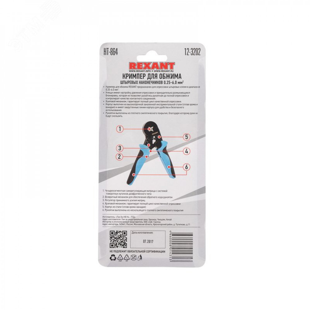 Кримпер REXANT HT-864 предназначен для обжима штыревых наконечников в диапазоне 0.25-6.0 мм2. Корпус выполнен из высокопрочной закаленной инструментальной стали (сплав хрома и ванадия) и имеет закругленные линии корпуса для удобства и безопасного использования. Четырехсегментная саморегулирующая матрица с системой поворотных кулачков диафрагменного типа Клещи имеют настройку давления опрессовки и принудительно размыкающуюся блокировку, которая не позволяет разойтись рукояткам до полной опрессовки, т. е. контролирует качество контактного соединения. Храповой механизм, гарантирует полный цикл качественной опрессовки. Рукоятки выполнены из плотного синтетического покрытия с резиновыми вставками, благодаря которому руки не будут скользить.