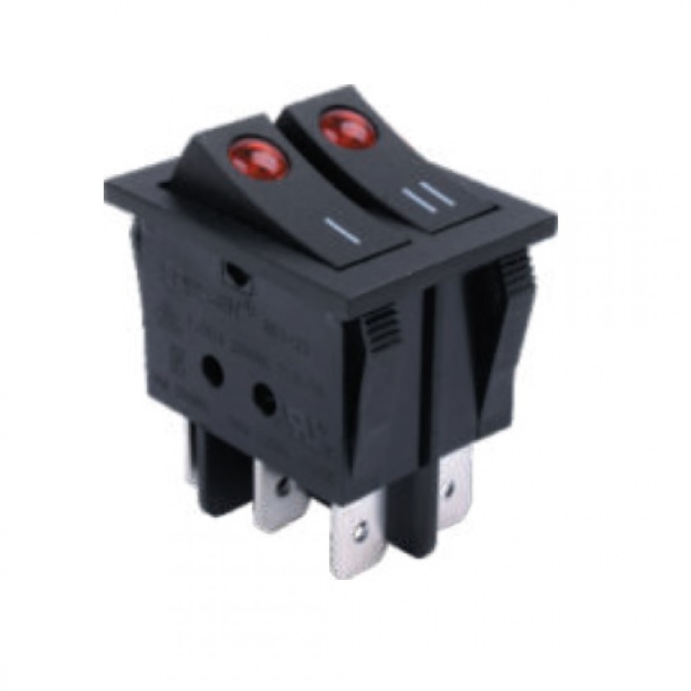 RK1-23AB 1X1X2N B/R"I,II", Выключатель клавишный ON-OFF с подсветкой цвет корпуса (черный) цвет кнопки (красный)