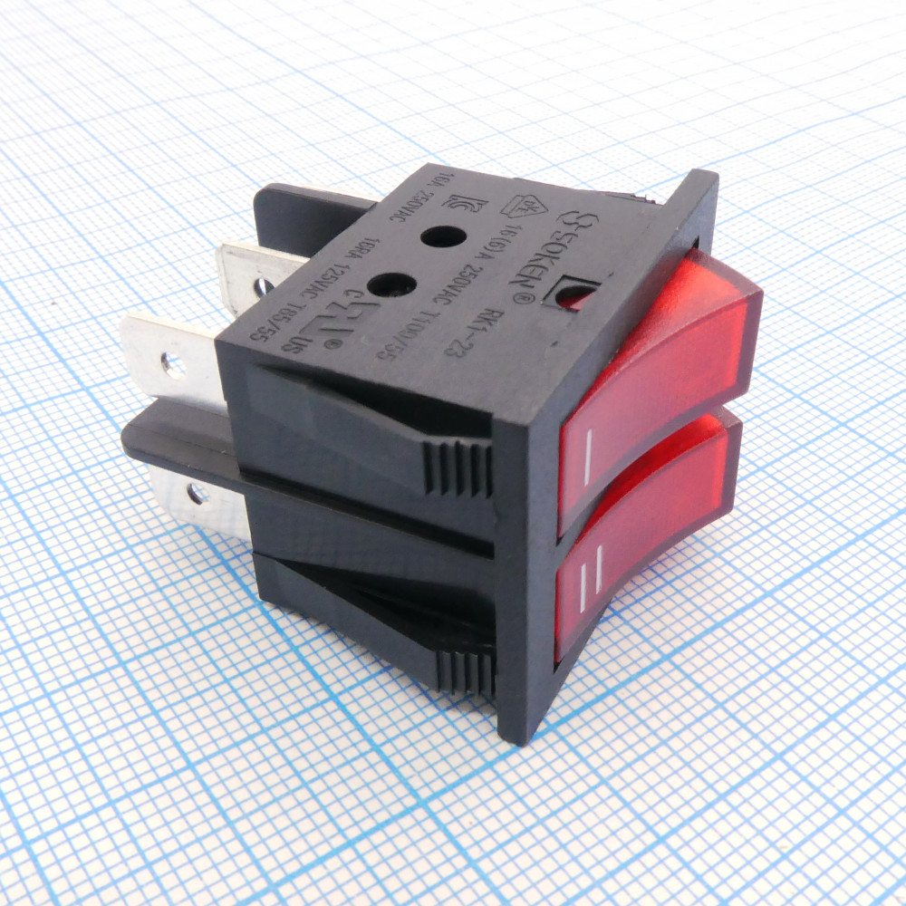 Доставка RK1-23AB 1X1X2N B/R"I,II" , Выключатель клавишный ON-OFF с подсветкой цвет корпуса (черный) цвет кнопки (красный)