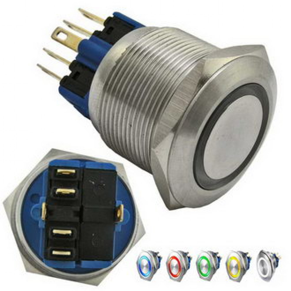 Антивандальная кнопка металлическая с фиксацией и с кольцевой подсветкой, посадочная резьба М25, контакты под пайку