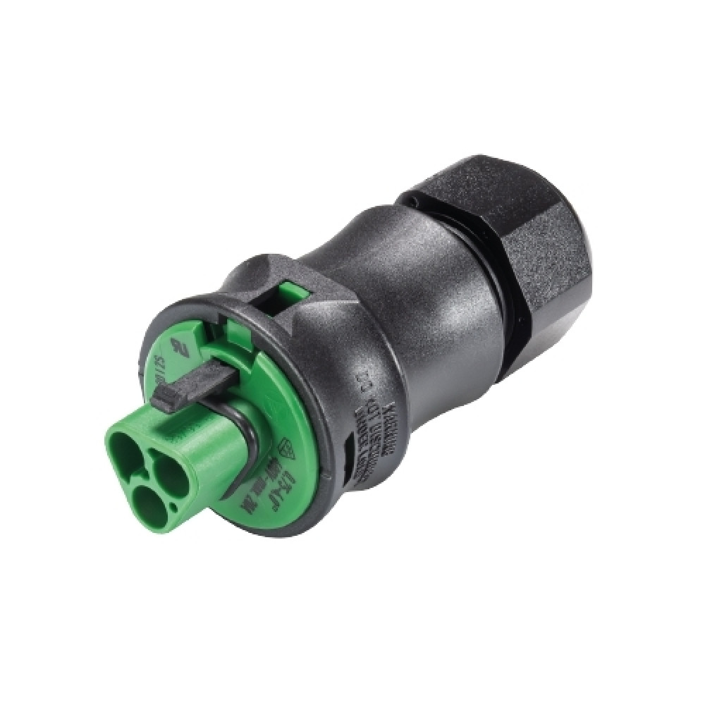 Вилочный разъем на кабель диаметром 10-14 мм, 2 полюса, тип фиксации провода: винтовой,номинальные характеристики: 250V, 20A, цвет корпуса: черный, цвет контактной вставки: зеленый, серия RST Classic