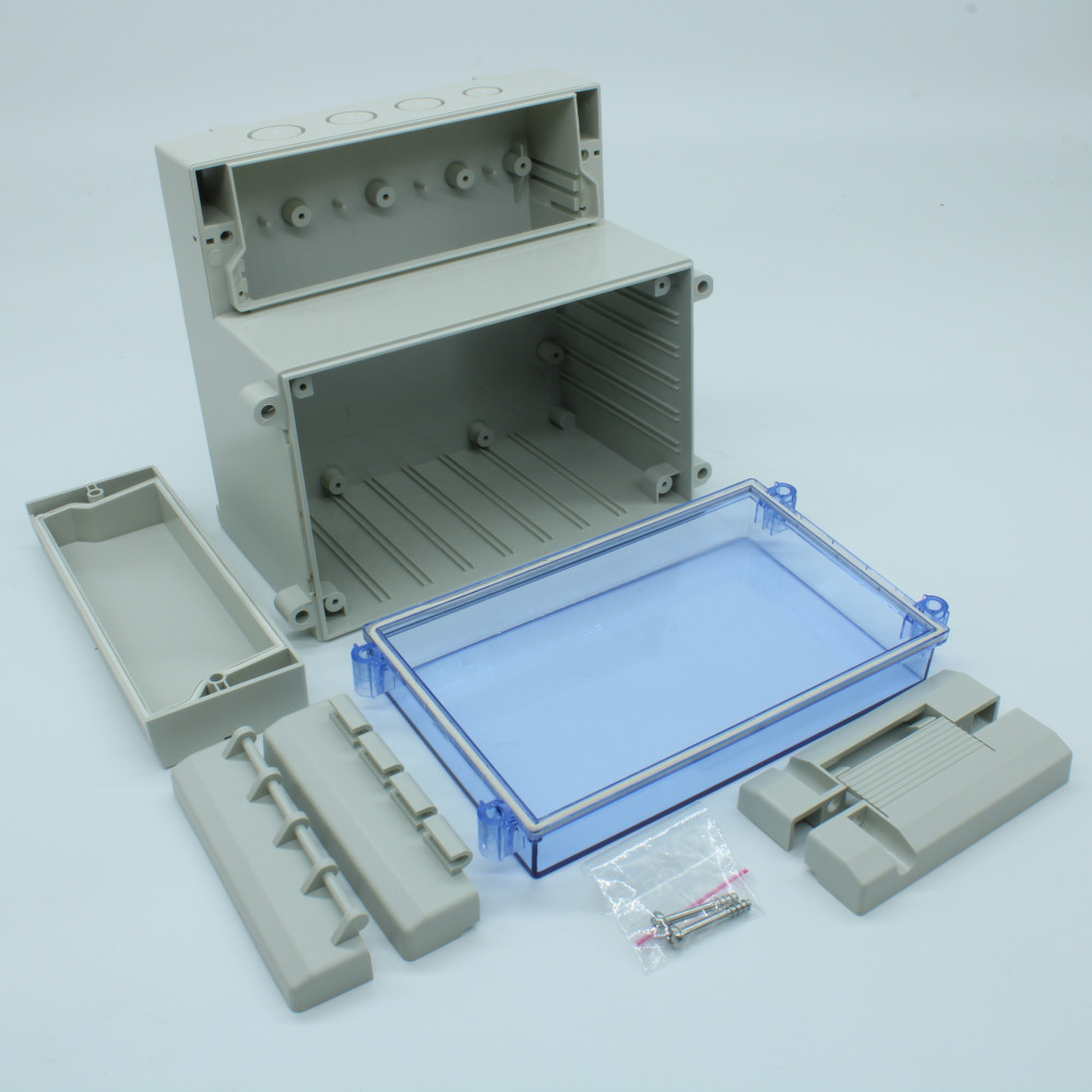 Двухсекционный корпус IP65 с откидной прозрачной синей крышкой, база ABS светло-серая, крышка из поликарбоната