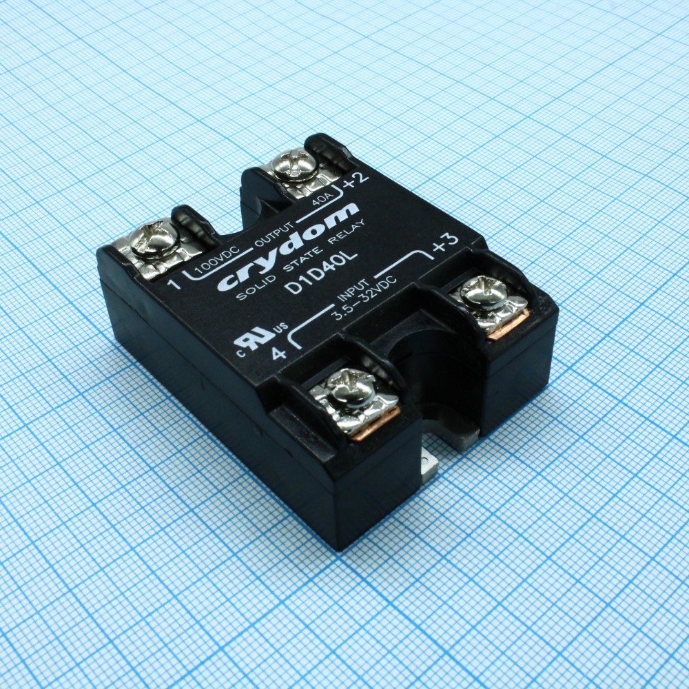 Доставка D1D40L , Реле твердотельное для коммутации постоянного тока 100В 40А, вход DC 32В 10мА, изоляция 3.75кВ, нормально разомкнутое, -40...100°C