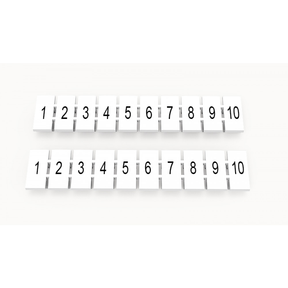 Маркировочные шильдики, для клемм сечением 2,5 мм.кв., боковая / верхняя, 10 шильдиков, нанесенные символы: 1...10, с горизонтальным расположением, размер шильдика: 4,8 x 8,3 мм, цвет: белый