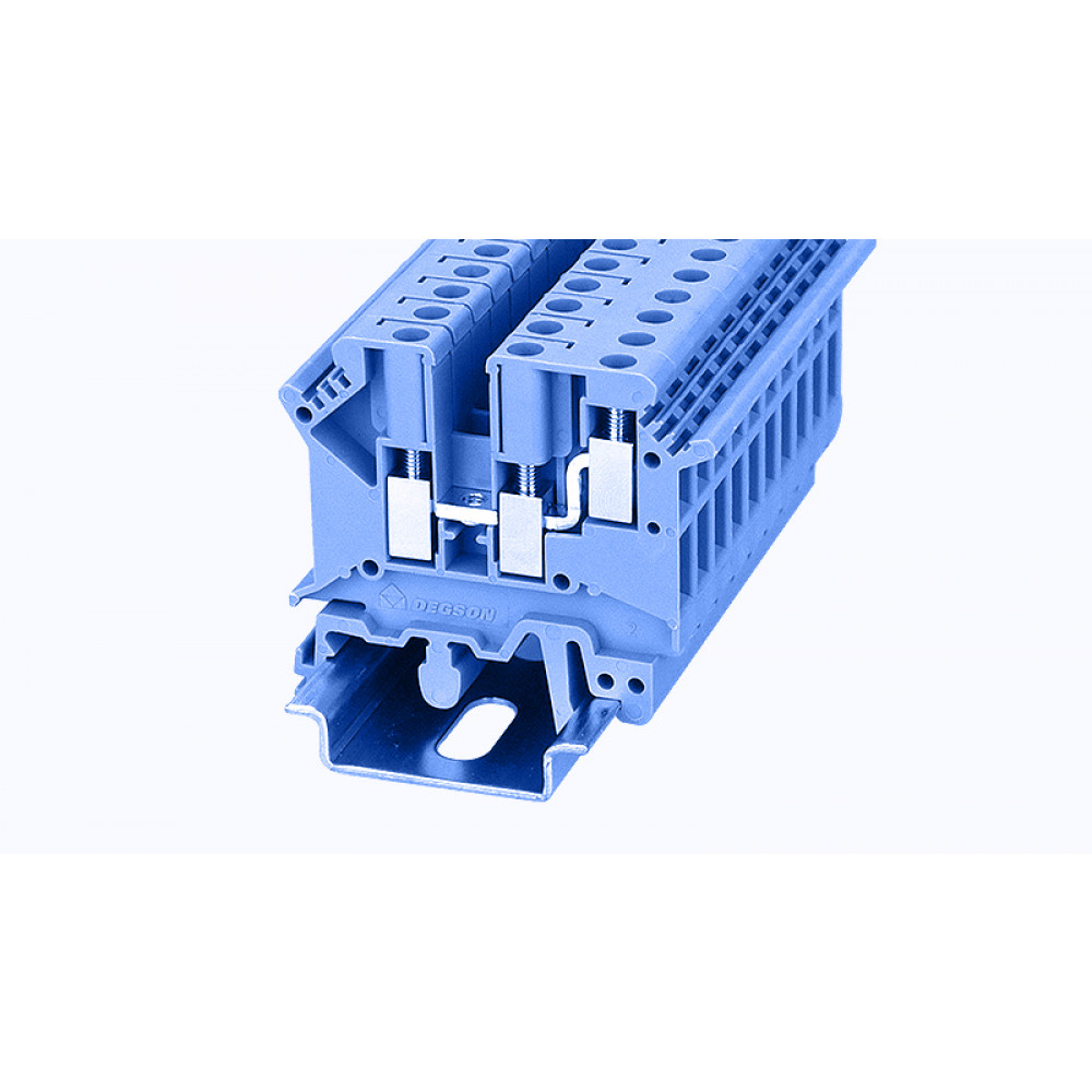 Проходная клемма, 3 точки подключения, тип фиксации провода: винтовой, номинальное сечение: 4 мм кв., 32A, 800V, ширина: 6,2 мм, цвет: синий, зажимная клетка - латунь, винтовая перемычка, тип монтажа: DIN35