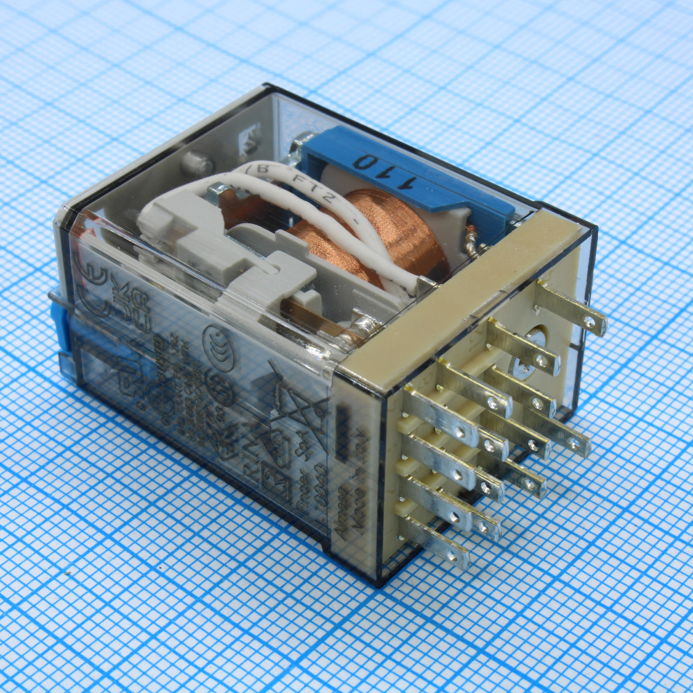 Миниатюрное универсальное электромеханическое реле; монтаж в розетку; 4CO 7A; контакты AgNi; катушка 110В DC; степень защиты RTI; опции: кнопка тест + мех.индикатор