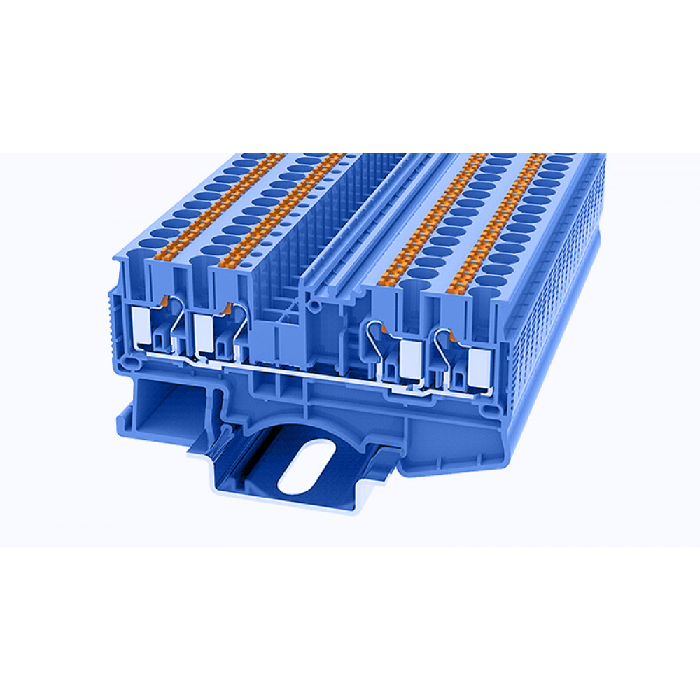 Проходная клемма, 4 точки подключения, тип фиксации провода: Push-in, номинальное сечение: 2,5/4 мм кв., 32A, 800V, ширина: 5 мм, цвет: синий, тип монтажа: DIN35