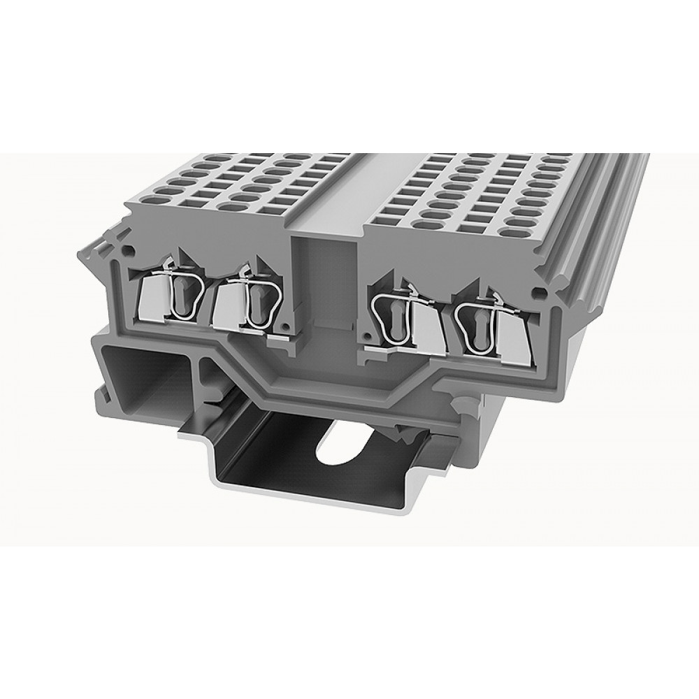 Проходная клемма, 4 точки подключения, тип фиксации провода: пружинный, номинальное сечение: 1.5 мм кв., 18A, 800V, ширина: 4 мм, цвет: серый, тип монтажа: DIN35