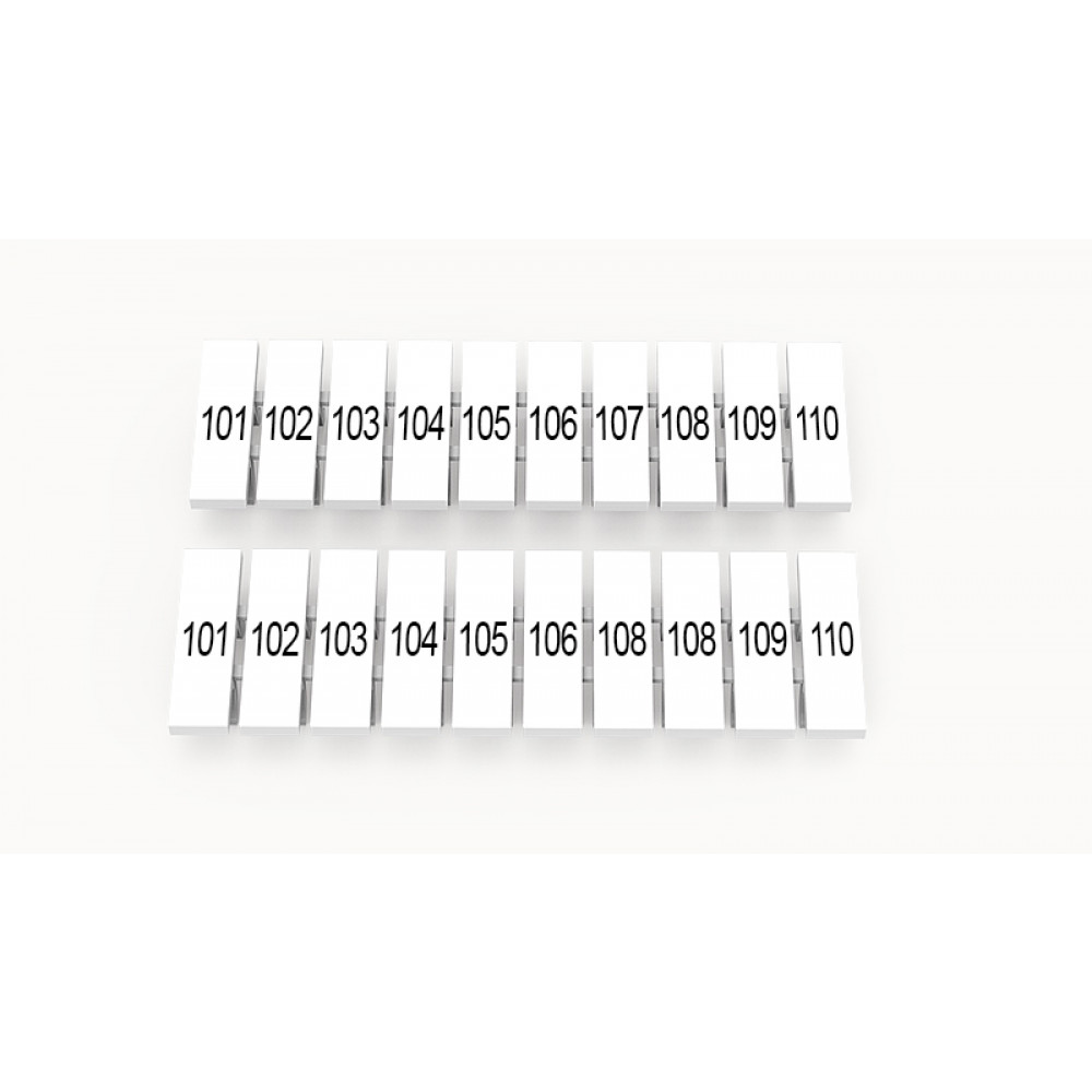 Кассета с маркировочными шильдиками, для клемм сечением 1,5 мм.кв., верхняя, 10 шильдиков, нанесенные символы: 101...110, с вертикальным расположением, размер шильдика: 2,95 x 10,7 мм, цвет: белый
