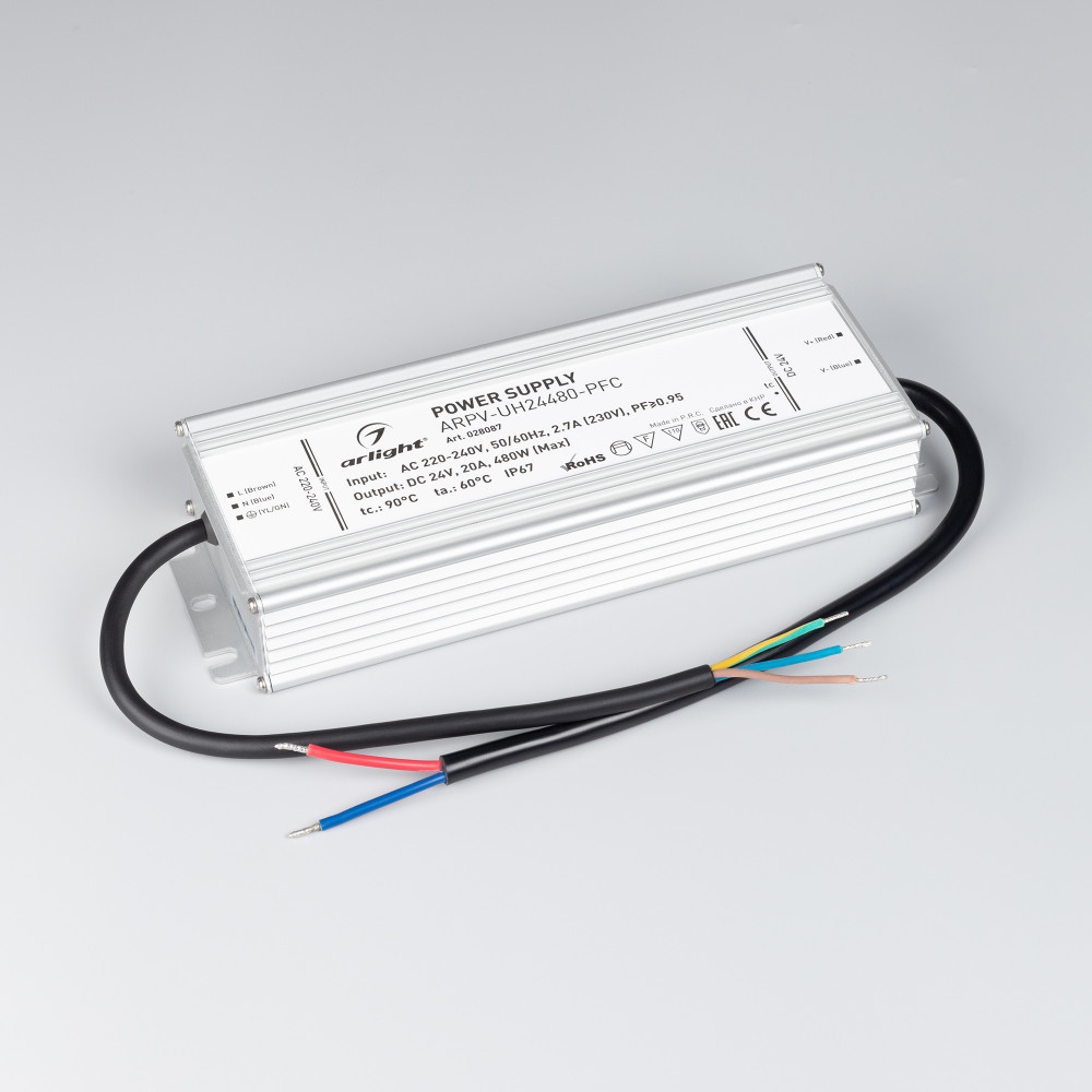 Блок питания ARPV-UH24480-PFC (24V, 20A, 480W) 028087, Источник напряжения с гальванической развязкой для светодиодных изделий. Входное напряжение 220-240 VAC. Выходные параметры: 24 В, 20 А, 480 Вт. Встроенный PFC >0,95. Герметичный алюминиевый корпус IP 67. Рабочая температура -40…+70C?. Габаритные размеры