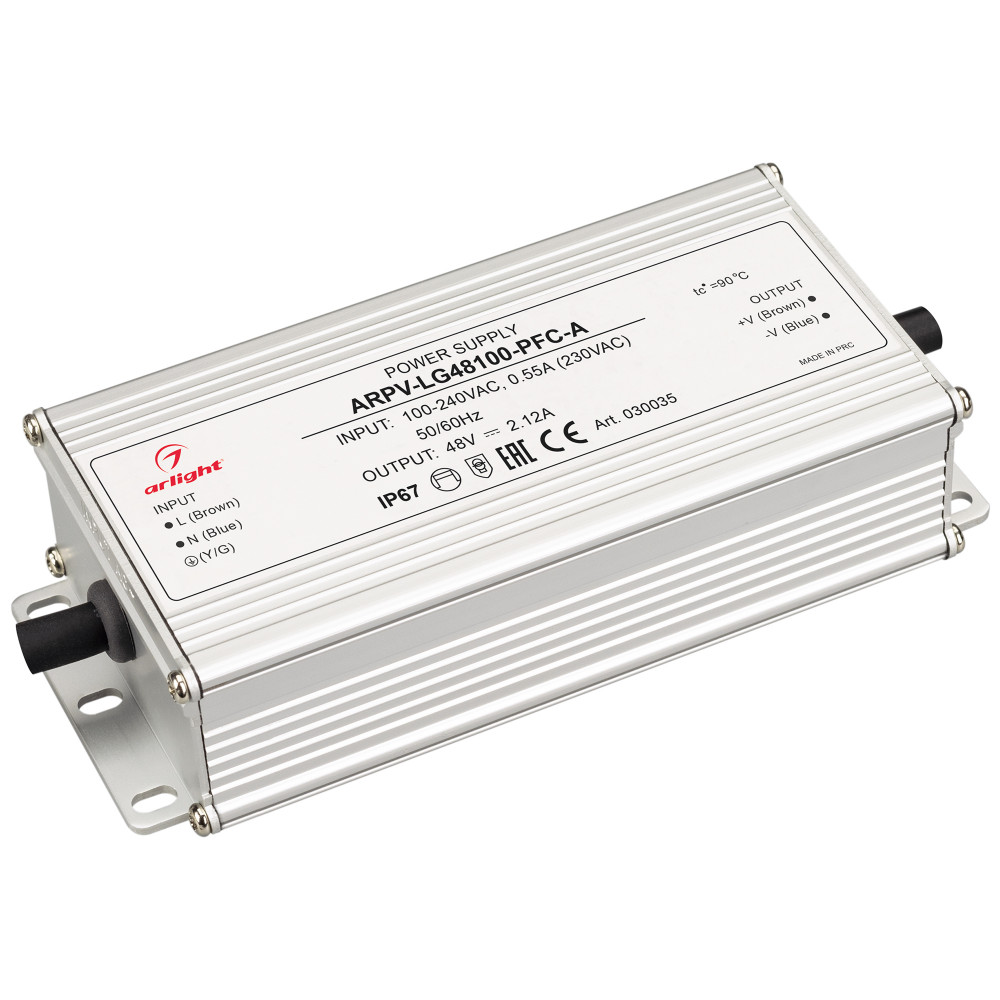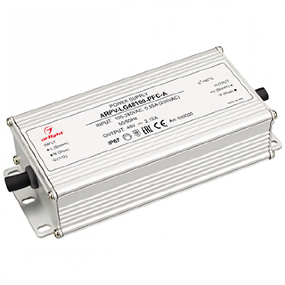 Блок питания ARPV-LG48100-PFC-A (48V, 2.12A, 100W) 030035, Источник напряжения с гальванической развязкой для светодиодных изделий. Входное напряжение 100-240 VAC. Выходные параметры: 48 В, 2.1 А, 100 Вт. Встроенный PFC >0,98. Герметичный пластиковый корпус IP 67. Рабочая температура -40…+70C?. Габаритные размеры