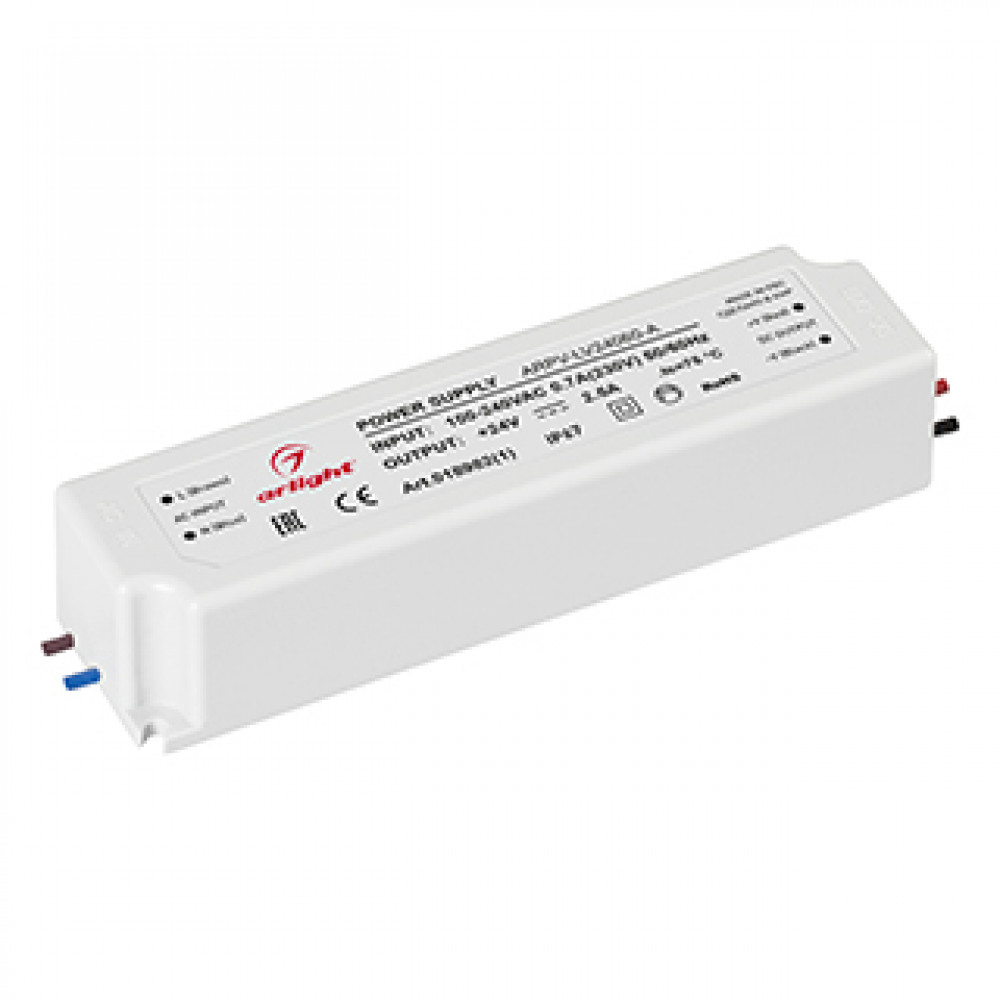 Блок питания ARPV-LV24060-A (24V, 2.5A, 60W) 018982(1), Источник напряжения с гальванической развязкой для светодиодных изделий. Входное напряжение 100-240 VAC. Выходные параметры: 24 В, 2,5 А, 60 Вт. Встроенный PFC >0,5. Герметичный пластиковый корпус IP 67. Рабочая температура -30…+70C?. Габаритные размеры д