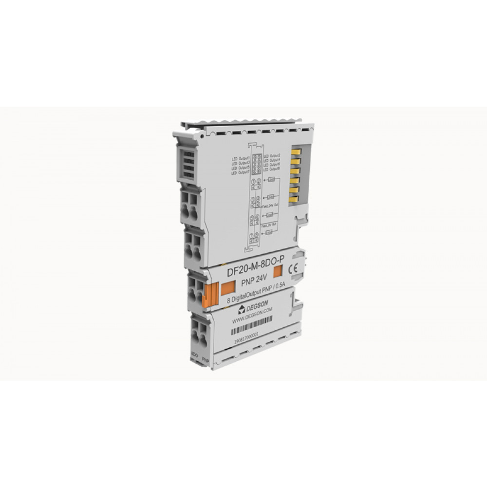 Модуль ввода цифр. DF20-M-8DO-P, Модуль ввода, цифровой, 8 каналов, поддержка ввода NPN, диапазон входных напряжений 0VDC / Высокоомное состояние, тип монтажа: DIN35