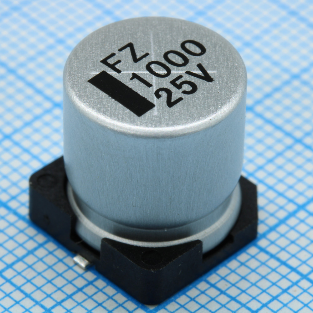 Конденсатор электролитический низкоимпедансный 1000мкФ ±20% 25В (10 Х 12.5мм) для поверхностного монтажа 2000часов 105C лента на катушке