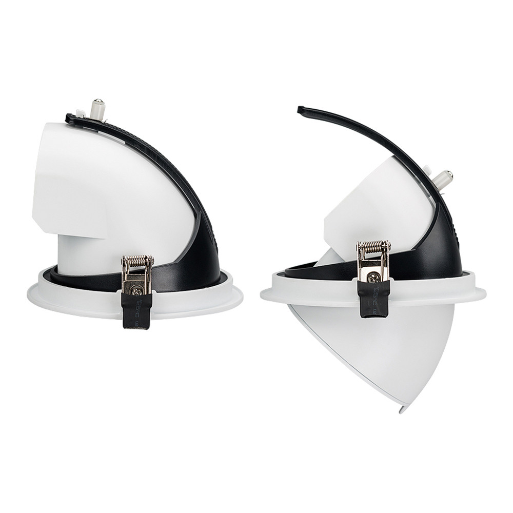 Встраиваемый поворотно-выдвижной светильник. Мощность 30 Вт, св. поток 2200-2500 лм, 73-84 лм/Вт, дневной 4000 K, CRI>90, угол 38°, напряжение питания 230 В. Белый круглый корпус из алюминия, экран стекло, степень защиты IP20. Угол поворота 350°, угол нак