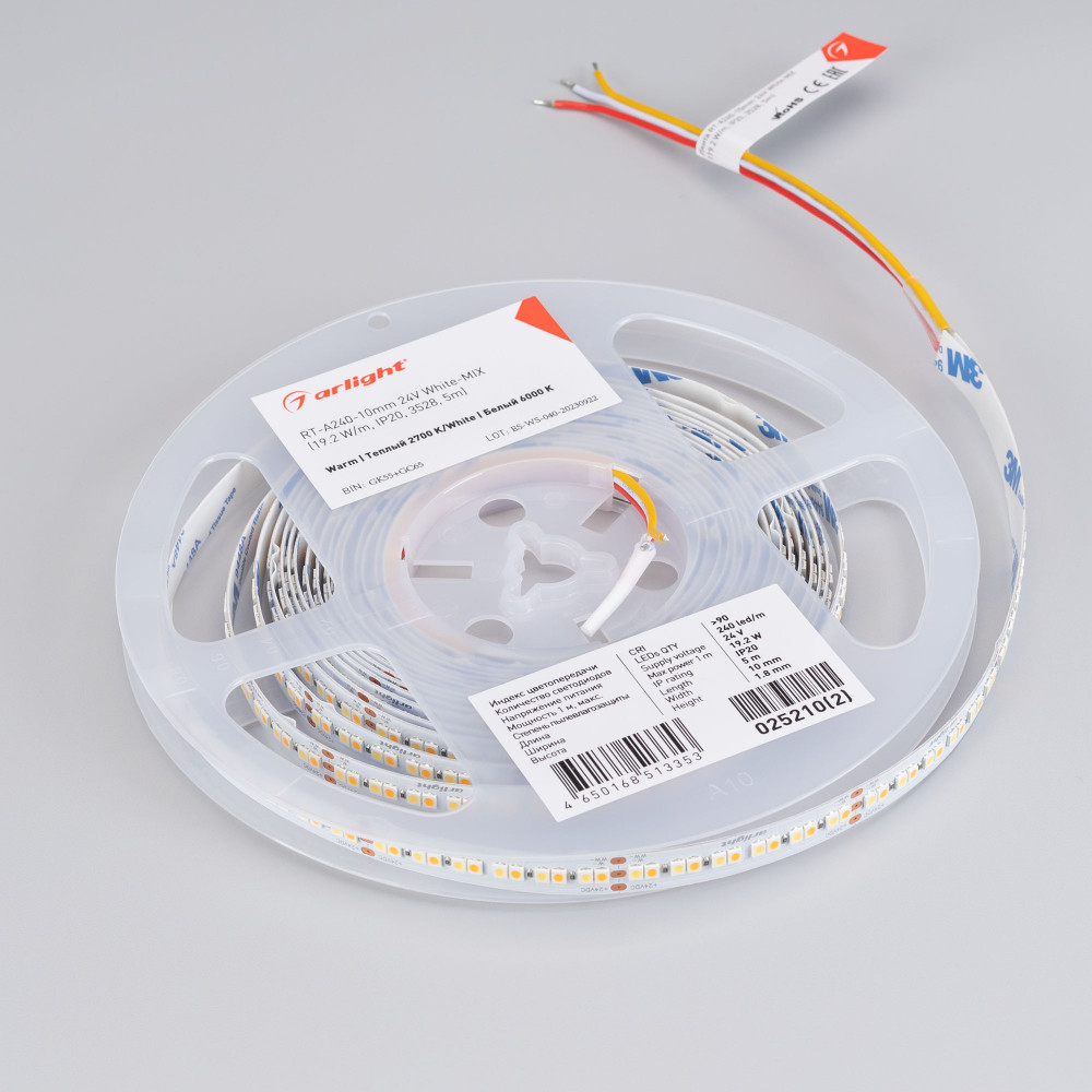 Лента RT-A240-10mm 24V White-MIX (19.2 W/m, IP20, 3528, 5m) 025210(2), Светодиодная лента открытая RT-A240 с изменяемой цв.температурой, светодиоды smd 3528, 240 шт/м (1200 шт на 5м), белая плата 10 мм, скотч 3М. Два цвета БЕЛЫЙ 6500 K + ТЁПЛЫЙ 2700 K. Угол 120°, цветопередача CRI>90. Питание 24V, мощность 19,2 Вт/м (96 Вт н