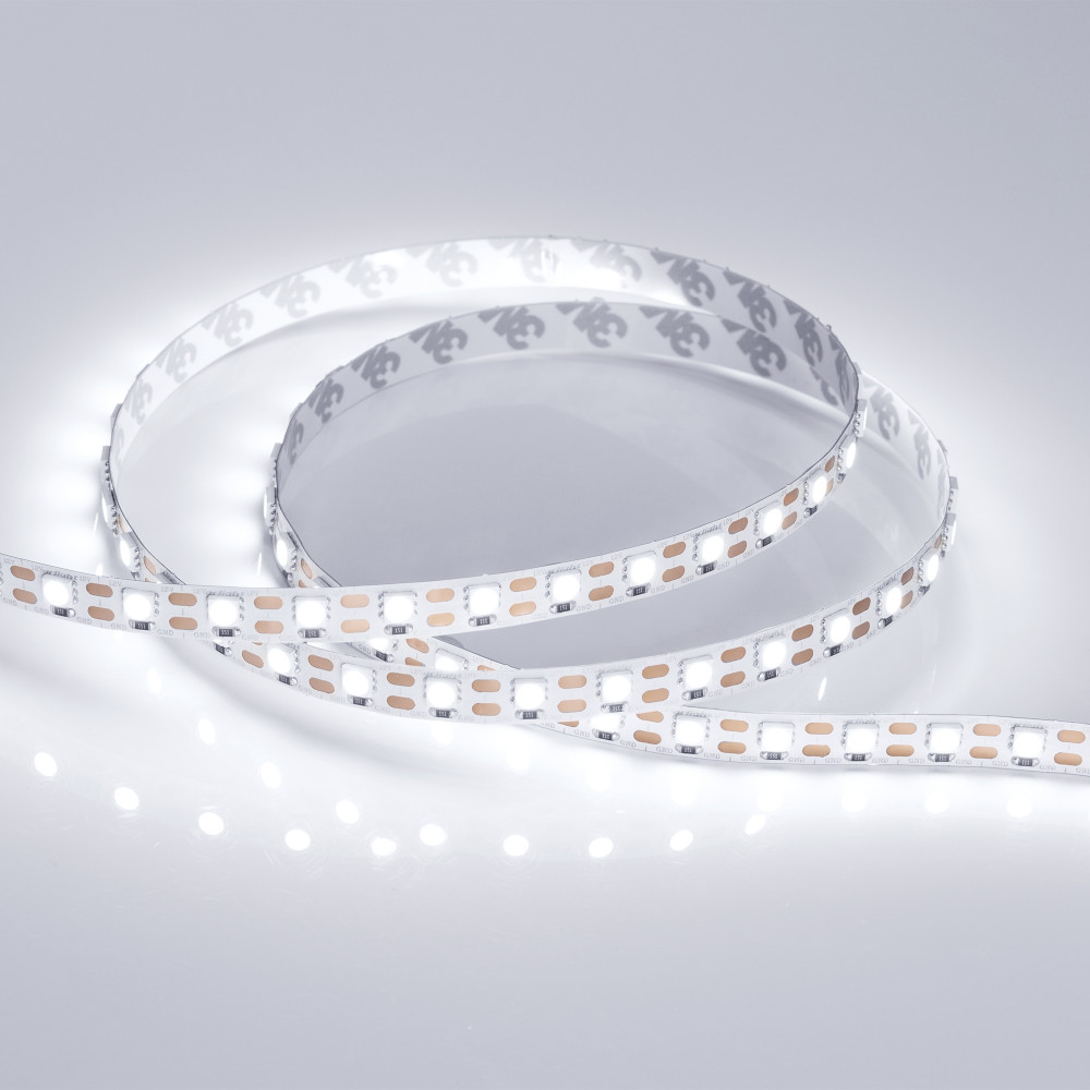 Гибкая лента, разрезается по одному светодиоду, smd 5060, 72шт/м (360шт на 5м), белая плата 10мм, скотч 3М. Цвет БЕЛЫЙ 5800-6500K. Питание 12V, мощность 15.6 Вт/м (78 Вт на 5м), угол 120°, цветопередача CRI>85. Размеры 5000х10x2.2мм. Мин.отрезок 13.9 мм,
