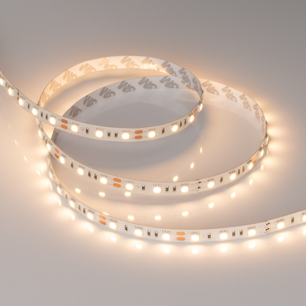 Светодиодная лента RT-B60, открытая. Светодиоды 5060, 60 шт/м (300 шт на 5 м), белая плата, ширина 10 мм, скотч 3M. Цвет ТЁПЛЫЙ 2700 K, цветопередача CRI>85, угол 120°. Питание 12V, мощность 14.4 Вт/м (72 Вт на 5 м). Размеры 5000x10x2.2 мм. Мин. отрезок 5