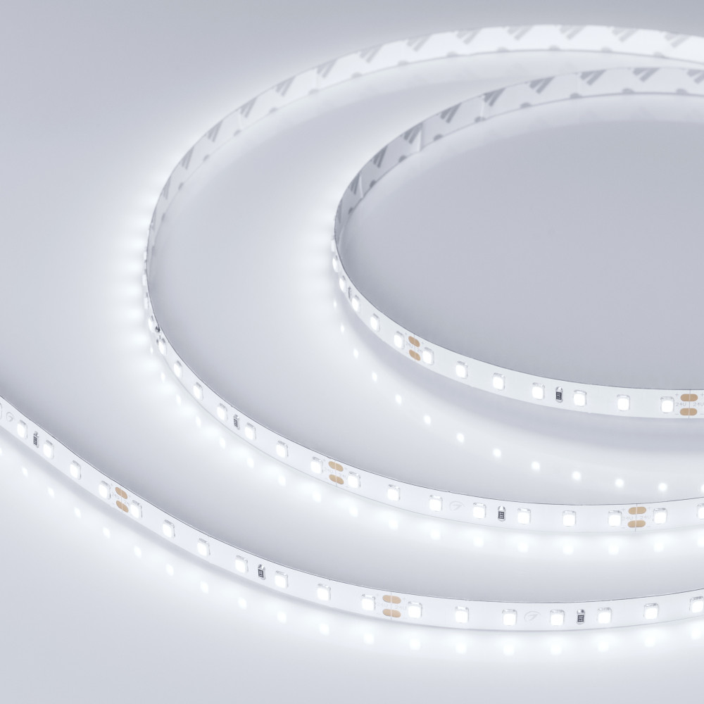 Светодиодная лента RT-A98, открытая. Светодиоды 2835, 98 шт/м (490 шт на 5 м), белая плата, ширина 8 мм, скотч 3M. Цвет БЕЛЫЙ 6000 K, цветопередача CRI>85, угол 120°. Питание 24V, мощность 10 Вт/м (50 Вт на 5 м). Размеры 5000x8x1.5 мм. Мин. отрезок 71.43