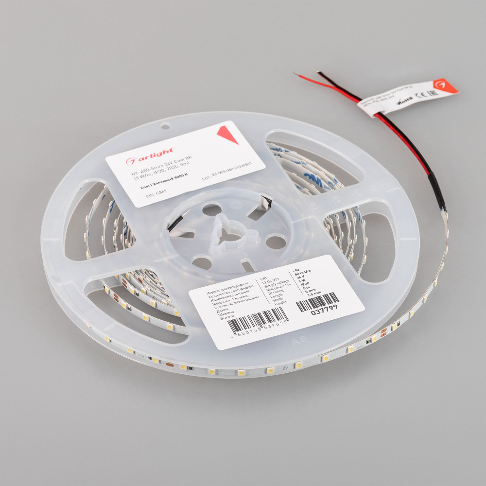 Лента RT-A80-5mm 24V Cool 8K (5 W/m, IP20, 2835, 5m) 037799, Светодиодная узкая лента RT-A80, открытая IP20. Светодиоды 2835, 80 шт/м (400 шт на 5 м), белая плата 5 мм, скотч 3M. Цвет ХОЛОДНЫЙ 8000 K , цветопередача CRI>90 , угол 120°. Питание 24 В, мощность 5 Вт/м (25 Вт на 5 м). Размеры 5000x5x1.5 мм. Мин.отрезок