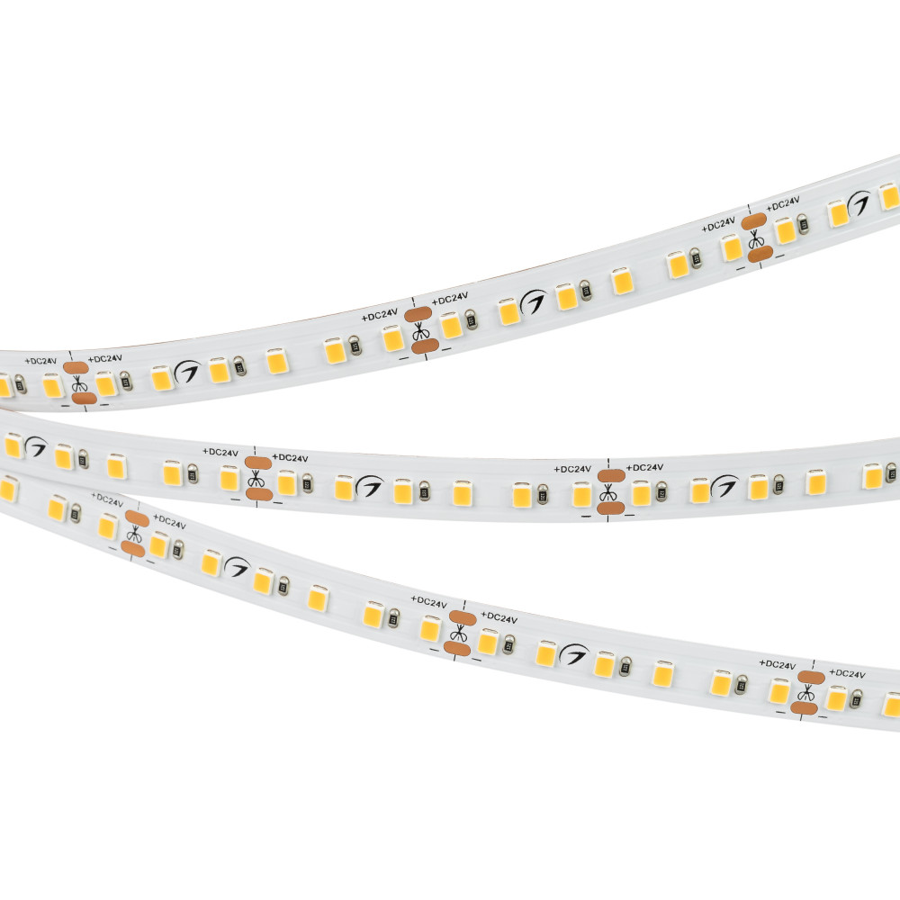 Гибкая лента повышенной прочности TWIST. Светодиоды 2835, 120 шт/м (600 шт на 5 м), белая плата, ширина 10 мм, скотч 3M. Цвет ТЁПЛЫЙ 3000 K, цветопередача CRI>90, угол 120°. Питание 24V, мощность 10 Вт/м (50 Вт на 5 м). Размеры 5000x10x1.5 мм. Мин. отрезо
