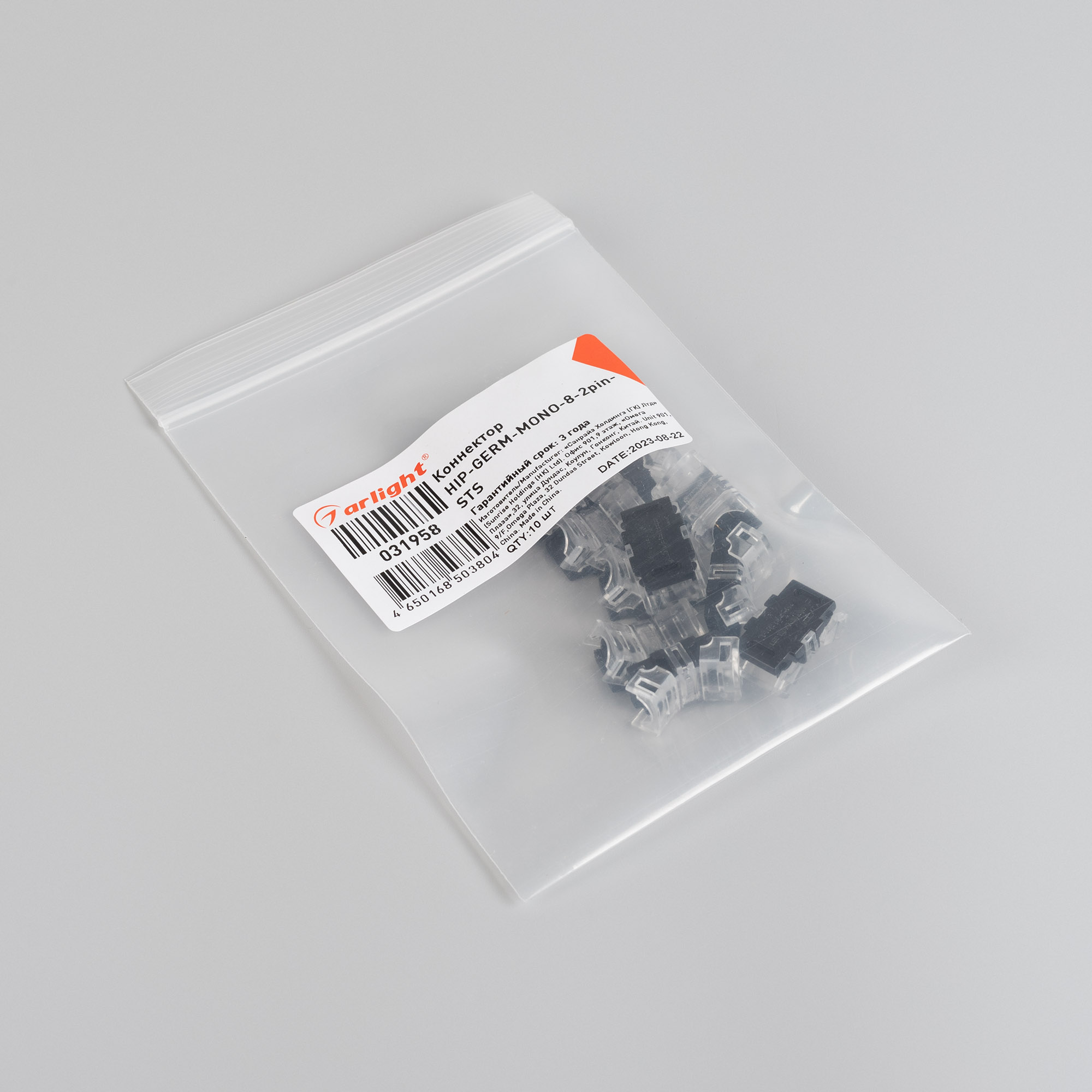 Коннектор HIP-GERM-MONO-8-2pin-STS 031958, Одиночный коннектор для соединения 2-х отрезков герметичных (IP54/IP65) светодиодных одноцветных лент SE (заливка силиконом сверху) шириной 8 мм. Материал - пластик. Максимальный допустимый ток 3 А, напряжение 3-24 В. Цена за 1шт. Разъем для FPC и FPC Одн