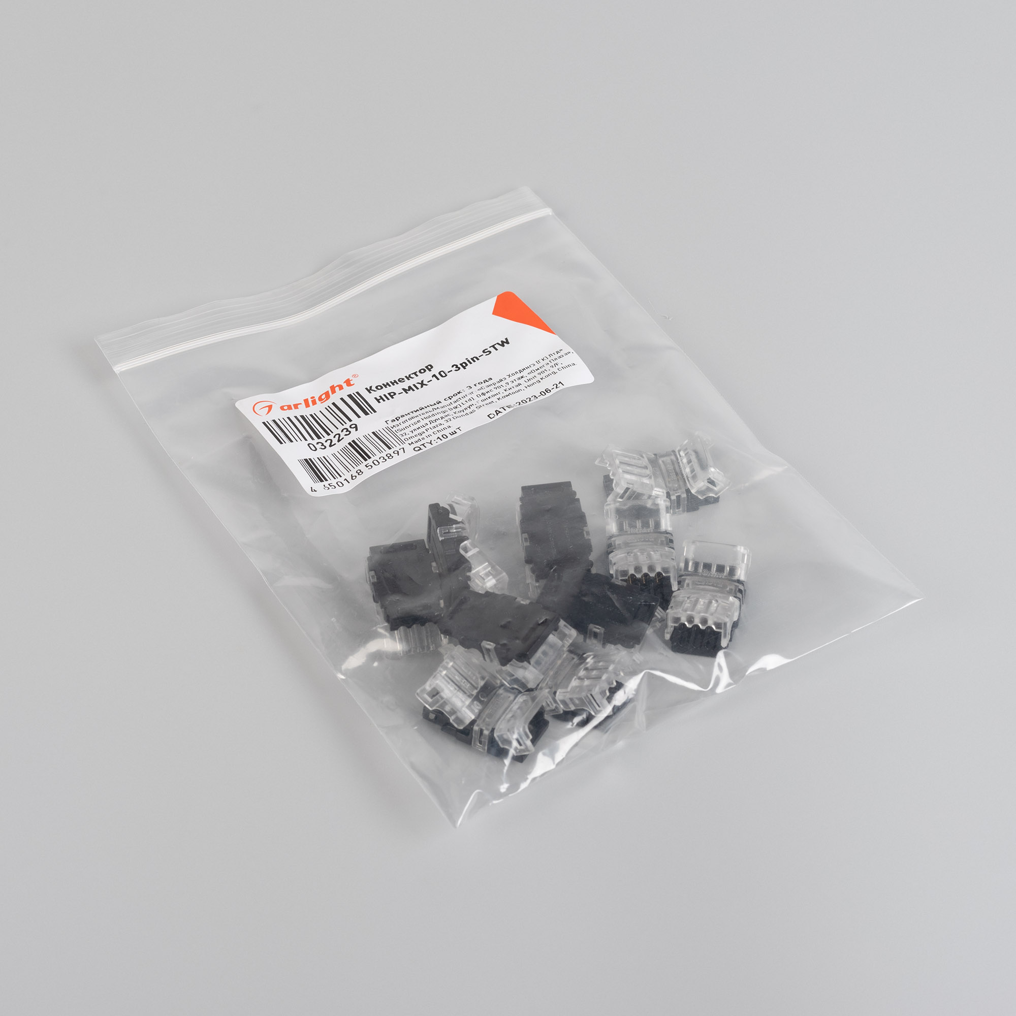 Коннектор HIP-MIX-10-3pin-STW 032239, Одиночный коннектор (без провода) для подключения питания к открытым лентам MIX шириной 10 мм. Очистка провода питания (0,34-0,75 мм2) от изоляции не требуется. Материал - прозрачный пластик. Максимальный допустимый ток 3 А, напряжение 3-24 В, степень защ