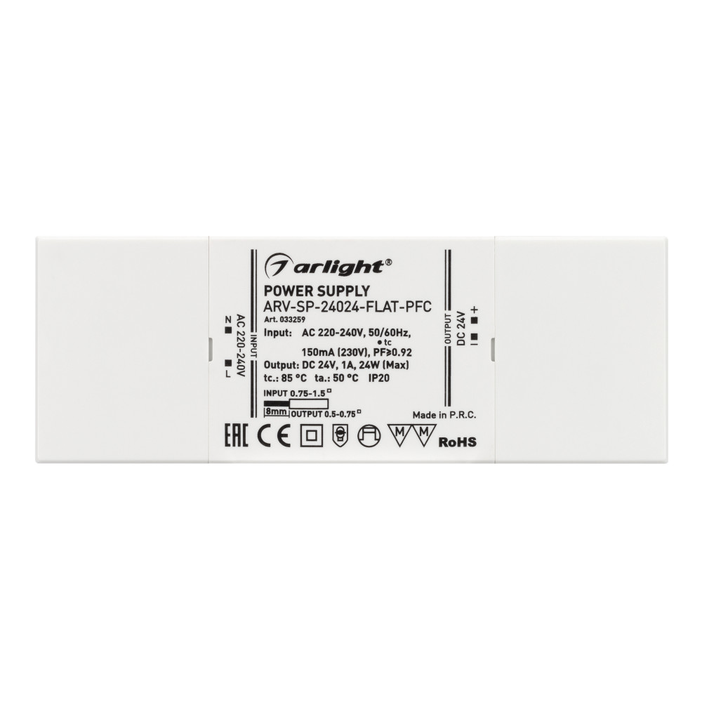 Блок питания ARV-SP-24024-FLAT-PFC (24V, 1A, 24W) 033259, Источник напряжения с гальванической развязкой для светодиодных изделий. Входное напряжение 220-240 VAC. Выходные параметры: 24 В, 1 А, 24 Вт. Встроенный PFC >0.95. Сверхтонкий пластиковый корпус IP20. Габаритные размеры длина 137 мм, ширина 50 мм, высота