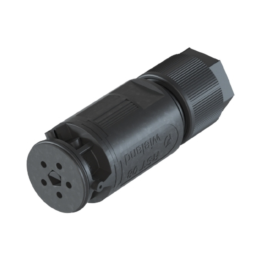 Розеточныйразъем на кабельдиаметром 5-10.6 мм,5 полюсов, тип фиксации провода: винтовой, номинальные характеристики: 250V/400V 8A, цвет корпуса: черный, цвет контактной вставки: черный,серия RST MICRO