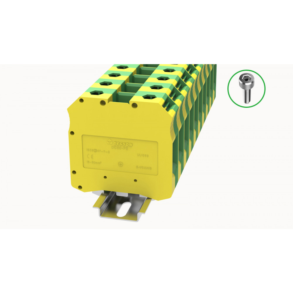 Заземляющая клемма, тип фиксации провода: винтовой, номинальное сечение: 50 мм кв., ширина: 20 мм, цвет: желто-зеленый, тип монтажа: DIN35 стандарт GB/T14048.1