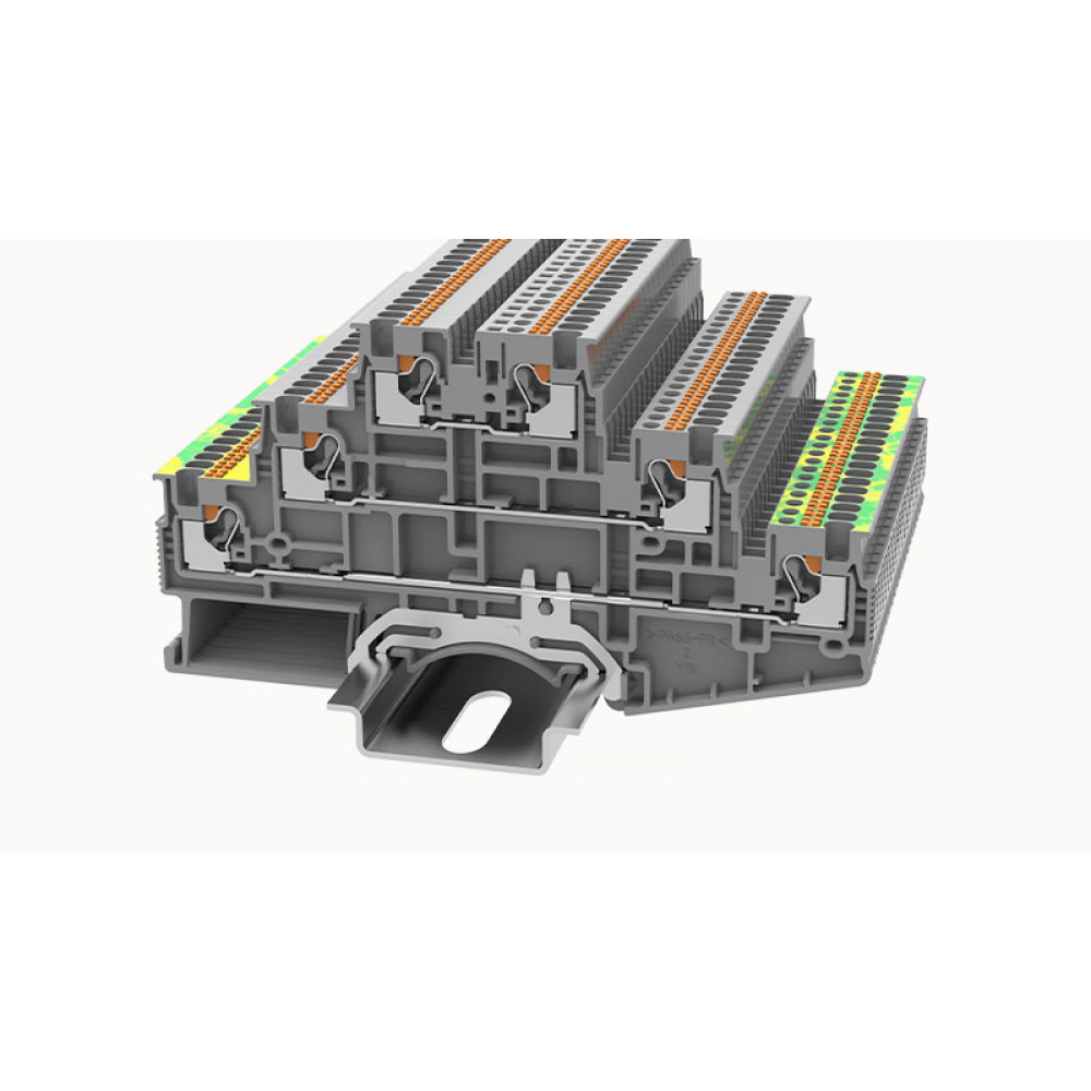 Этажная клемма, 3 этажа, L-L-PE, нижний ряд с заземлением, тип фиксации провода: Push-in, номинальное сечение: 1.5 мм кв., 15A, 500V, ширина: 3,5 мм, цвет: серый, тип монтажа: DIN35